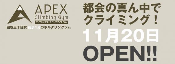 株式会社APEX SOLUTIONSは、新宿区東京メトロ丸の内線【四谷三丁目駅】徒歩1分にボルダリング(ロープを使わないクライミング)を初心者から中上級者まで楽しめる、APEX Climbing Gym(エイペックスクライミングジム)をオープン致します。