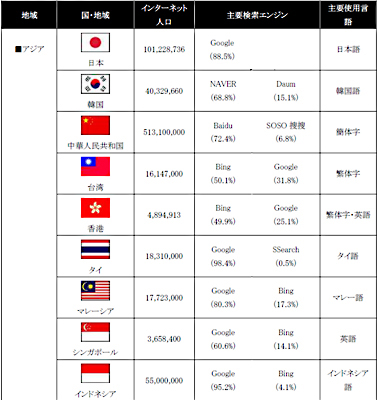 ・アジア: 韓国、中国では、NAVER、百度に加え、各国独自の検索エンジンのシェアが65%以上を占めています。台湾、香港ではBingが約50%を占めています。東南アジア、中央アジアでは、Googleが60%以上を占めています。