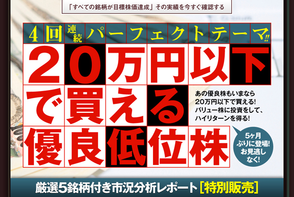 ・商品名:厳選5銘柄付き市況分析レポート「20万円以下で買える優良低位株」