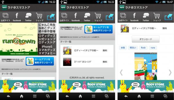 「ラナ@スマストア」では、上部メニューアイコンから公式ページ/Facebook/Twitter/ショップにアクセスが可能です。また、3つのビックバナーから、3種類の広告を設置し、物販などをご紹介しています。
