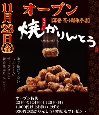 OPEN当日の11/23(金)~11/25(日)の3日間、OPEN記念と致しまして1000円以上ご購入いただきましたお客様に焼かりんとう(630円)を1袋プレゼント致します!