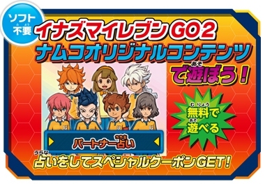 「ナムコのお店でDS」実施店に「ニンテンドーDSシリーズ」をお持ちいただき「イナズマイレブンGO2」期間限定オリジナルコンテンツをお楽しみいただくと、抽選でナムコのお店で使用出来る「スペシャルクーポン」をプレゼントいたします。