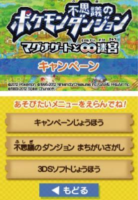 株式会社ナムコ(東京都大田区)は、2012年11月23日(金・祝)から全国直営アミューズメント施設約200店舗で、任天堂株式会社の携帯ゲーム機「ニンテンドーDS(R)シリーズ」を利用したネットワークサービス「ニンテンドーゾーン」を使用した「ナムコのお店でDS」にて期間限定コンテンツ「ポケモン不思議のダンジョン~マグナゲートと∞(むげんだい)迷宮(めいきゅう)~キャンペーン」をスタートします。