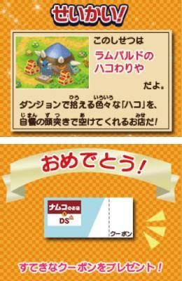 「ナムコのお店でDS」実施店に「ニンテンドーDSシリーズ」をお持ちいただき、期間限定コンテンツ「不思議なダンジョン間違い探し」で配信中の「クイズ」に参加すると、抽選でナムコのお店で使用出来る「スペシャルクーポン」をプレゼントいたします。※「スペシャルクーポン」の内容は実施店舗によって異なります。「ナムコのお店でDS」では、今後もオリジナルコンテンツを利用したサービスを展開してまいります。