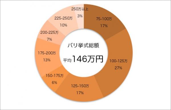 先輩カップルたちは、バリでの結婚にどのくらいの費用をかけているのでしょう。この質問の回答平均金額は、146万円という結果に。さらにボリュームゾーンは100~125万円(27%)でした。