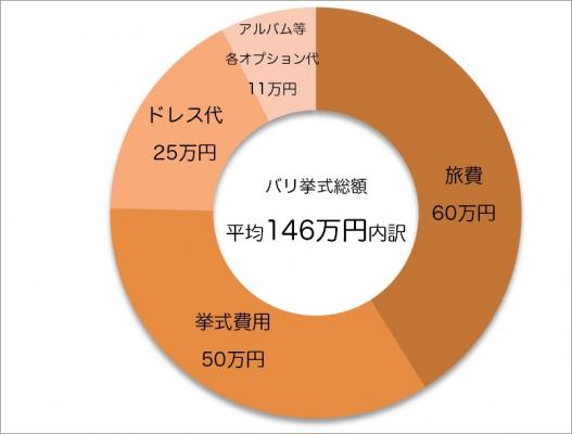 内訳を見てみると、最も大きな割合を締めるのが旅費で60万円、次いで挙式費用50万円、ドレス代25万円…という結果に。旅費を除いた費用が、86万円となりこれ自体は国内の平均金額131万円※と比べるとリーズナブルという結果に。※「ゼクシィ結婚トレント調査首都圏2011」(リクルート社調べ)