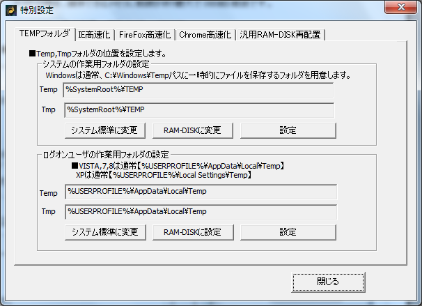 WindowsのTEMPフォルダ、IEのキャッシュ、ブラウザキャッシュをRAM-DISKにワンタッチで再配置する機能を装備。