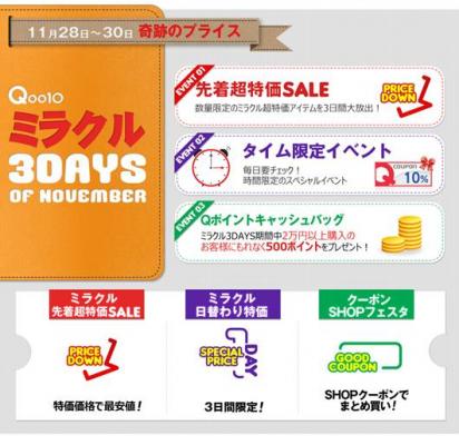 オンラインショッピングモールQoo10を運営している、ジオシス合同会社(本社:シンガポール)は、2012年11月28日(水)~2012年11月30日(金)の3日間、自社サイト(www.qoo10.jp)ではQoo10(キューテン)ミラクル3DAYS(OF NOVEMBER)を開始いたします。