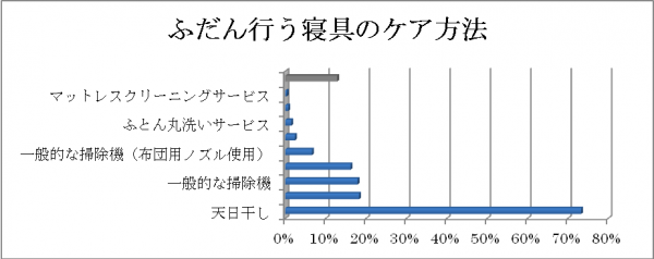 アンケート結果では、1位が天日干し73%、2位が除菌・消臭スプレー18%となり、布団の掃除方法は天日干しが圧倒的に多い結果となりました。しかし、東京環境アレルギー研究所の試験結果によると、天日干しではハウスダスト・ダニはわずか3.8%しか除去できなかったことから、新しい布団ケアが必要と考えられます
