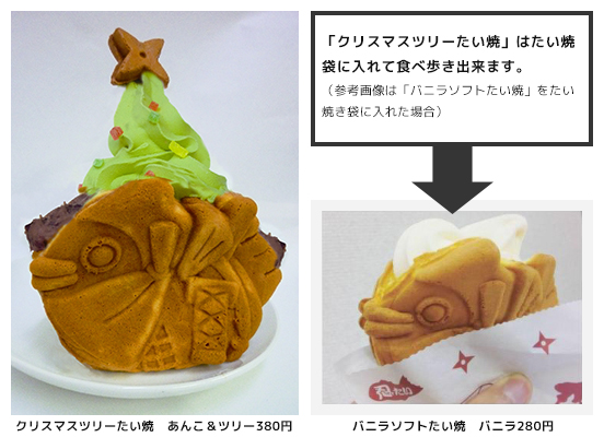 ソフトクリームを使った当店人気メニュー「バニラソフトたい焼」をクリスマスバージョンにしたメニューで、パンケーキの様にふわふわで焼き立てのたい焼き生地に、頭から尻尾にかけて半分切れ目を入れ、あんこと抹茶ソフトクリームを生地でサンドするように盛り付け、クリスマスツリー定番の星の代わりに「手裏剣焼き(2種類いずれか)」をトッピングした、忍者たい焼ならではのメニューです。