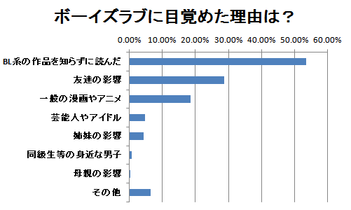BLに目覚めた原因は、「BL系作品を知らずに読んだ」が最も多く、次に「友達の影響」「一般漫画やアニメ(妄想,二次創作等)」と続きます。なお、BL作品へのファーストコンタクトには「ネットの影響」が多く挙げられていました。