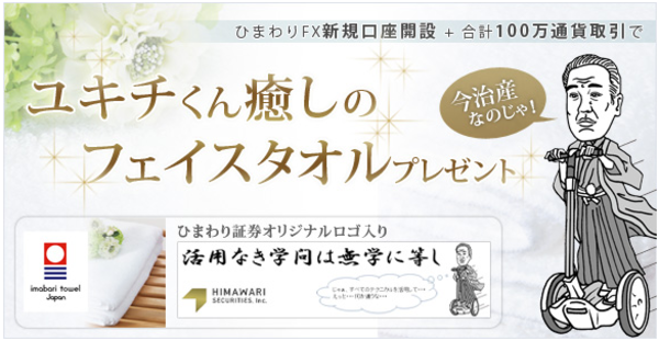 日本で初めてFX取引を提供した「ひまわり証券」(東京都港区、代表取締役 神馬宗夫)は、2012年12月3日(月)から、ひまわり証券のFX取引口座「ひまわりFX」を新規開設し、取引量が期間累計100万通貨の達成されたお客様に、ひまわり証券オリジナルのフェイスタオルをプレゼントする「今治産!ユキチくん癒しのフェイスタオルプレゼント!キャンペーン」を実施いたします。