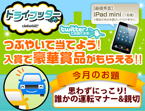 抽選対象者:お題「思わずにっこり!誰かの運転マナー&親切」を、キャンペーンサイトのツイッターフォームからつぶやいていただき、その上で応募フォームからご応募いただいた方