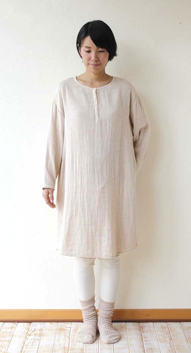 「ダブルガーゼチュニック」はリラックス&ナチュラルを追求したリラックスウェアで、メイド・イン・アースの純オーガニックコットン100%インナーレギンスやシルクの五本指ソックス、オーガニックコットンの五本指ソックス、先丸ソックスなどと重ねた冷えとりスタイルとも合わせやすいのが特徴です。また、外出着としてもご使用いただけるデザインで、デニムなどと合わせればタウンユースのアウターとしても活躍します。
