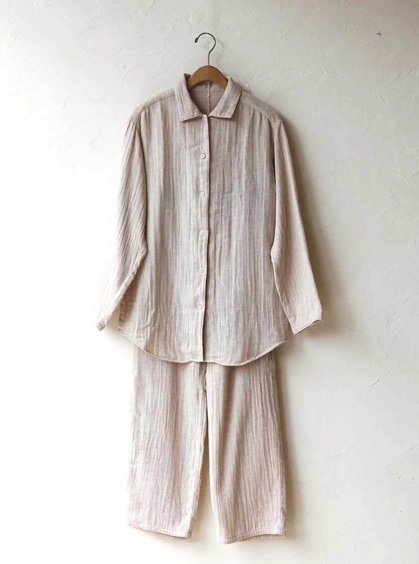 「ダブルガーゼパジャマ」は、シンプルなシャツデザインと、ストレートラインのたっぷりしたズボンで、年齢や体型問わずゆったりした着心地と肌ざわりのよさを実感していただけます。甘く織ったガーゼ生地を2枚重ねたダブルガーゼ素材は、冬は空気をたっぷり含み保温性に富み、春秋は風通しよく、1年通して活躍するアイテムです。