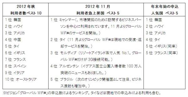 ※ビジョン「グローバルWiFi(R)」の申込数によるランキング。タイなどは現地での申込みによる利用も含む。