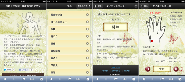 アプリ版は、日本語・英語・韓国語・中国語・フランス語の5か国語に対応しており、販売実績"15万本"のロングセラーアプリです。歯痛、二日酔い、食べ過ぎ、肩こり、頭痛、目の疲れ、ストレス、美肌、便秘など数多くの人体の「つぼ」を探すことができます。ダイエット、安眠、冷え性などのタイマー付きの便利な刺激コースのメニューもあります。