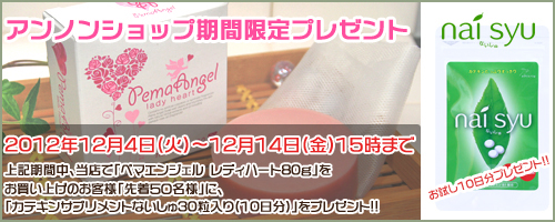 2012年12月4日(火)~12月14日(金)15時までの期間中に当店人気No.1ジャムウソープ「ペマエンジェルレディハート80g」( http://item.annonshop.com/?pid=41677484 )を お買い上げのお客様「先着50名様」に、大人気商品「カテキンサプリメントないしゅ」の30粒入り(お試し10日分)をプレゼントいたします。