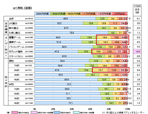 据え置きゲーム機、タブレット端末ユーザーで毎日プレイするユーザーの約2割が月に1万円以上ソフトにお金を使っているということがわかりました。