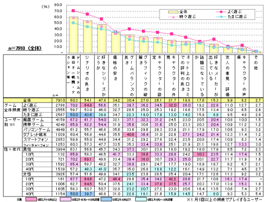 ゲーム頻度が高い(よく遊ぶ)層では、「シナリオの良さ」、「キャラクターの外見」を重視する特徴がみられます。