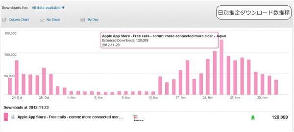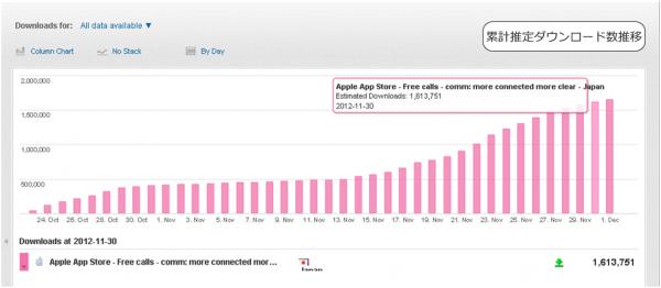 Distimo(ディスティモ)のデータによれば、「comm」iPhone版アプリは、配信翌日の10月24日には無料アプリランキングの第1位にランクイン。その後ランキング/ダウンロード数は低迷するが、TVコマーシャル等マーケティング効果か、11月15日から急上昇しその後はランキング上位を維持して、11月30日時点での累計ダウンロード数は161万に達したと発表。また推定ダウンロード数最大は11月23日(祭日)で、この1日だけで推定12万8千のダウンロードを達成したとしている。