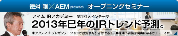元オグルヴィ社で、数々の大手上場企業IRコンサルティングで辣腕を奮ってきた、あの徳舛 剛氏による、2013年巳年のIRトレンド予測セッションです。
