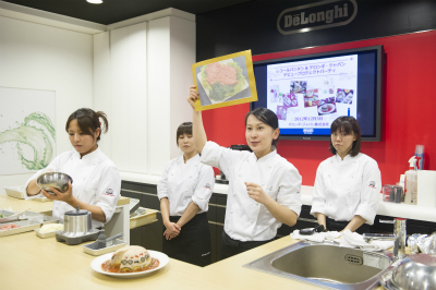 最優秀チームに選ばれた学生達は、レシピ説明や作業の手順、製品の使用方法だけでなく、食材の特徴や効能等についても分かりやすく丁寧にプレゼンテーション。この日振る舞った5品のレシピのうち、3品のデモンストレーションをお客様の前で披露しました。お客様に質問を投げかけたり、一緒に製品を試しながら進行し、最後は出来上がった料理を囲んで参加のお客様、デロンギのスタッフ、レコールバンタンの学生達が会話を楽しみながら料理を味わい、一体感のある和やかなイベントとなりました。