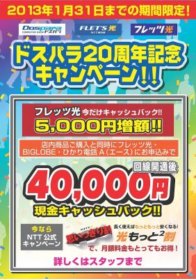 株式会社ドスパラ(取締役社長: 畑谷浩治、本社 : 東京都千代田区)は、2012年12月10日(月)より、ドスパラの創業20周年を記念して、パソコンやタブ レットなどの店内商品ご購入と「フレッツ光」「BIGLOBE」の同時ご契約で最大4万円がキャッシュバックになるキャンペーン