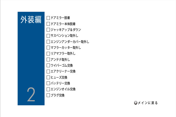 [車両DIY整備の内容をDVDにて収録] 書籍ではわかりづらい、部品の脱着方法などを動画で撮影 ・外装編、内装編の中に場所毎にメニュー選択で素早く見れます! ・部品を付けたいけど工賃高いし!で諦めていた方などこのDVDで工賃を浮かして下さい!