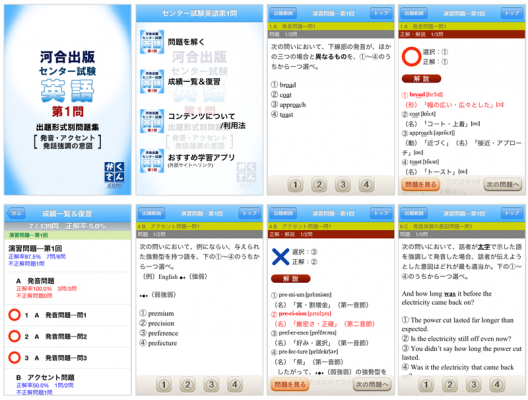 学習専門図書サイバーモールなどを運営する株式会社ブックモールジャパン(代表取締役社長:山田俊明)は、iPhone 向け学習アプリケーションの新作として、株式会社河合出版の協力のもと『センター試験英語第1問 出題形式別問題集[発音・アクセント・発話強調の意図]』を開発し、「学参ドットコム」ブランドにて12月10日より App Store での発売を開始しました。価格は、600 円(税込)です。