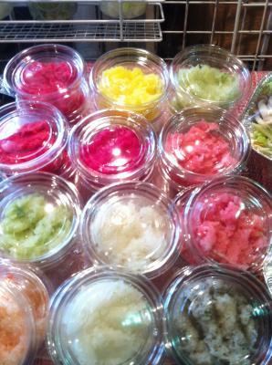 "カラフルおろし”はお客様の小さいなスマイルをテーマに今年10月中旬より開始した商品です。これまでの白・赤(紫大根)・ピンク(紫大根&大根)・橙(人参)・緑(大葉)・黄・ブラッドオレンジに加えて黒色が新登場致しました。今後も新色が続々と登場する予定です。今回はお客様との会話の中から生まれた当社自慢の大人気"カラフルおろし"地域密着型の808倶楽部(http://www.808club.jp)ならではの商品に新色が登場致しましことを報告致します。1カップ50円・3カップ100円とリーズナブルに楽しめるのも人気のひとつ。仕事帰りの近所のお惣菜に!インスタント麺に!鍋に!パーティ!にとひっぱりだこの"カラフルおろし"