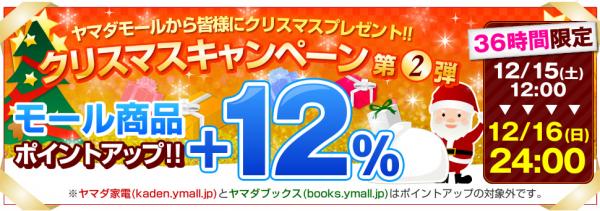 をコンセプトにヤマダ電機が運営する「ヤマダモール」が、12月15日(土)12時~12月16日(日)24時の期間で、モール商品のご購入でポイントが+12%にアップされる「クリスマスキャンペーン第2弾」を開催いたします。