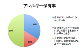 また、今回行ったアンケートでは、「自分がアレルギーにかかっている」人が34%と、厚生労働省が発表しているアレルギー保有者の割合とほぼ等しい結果となっています。