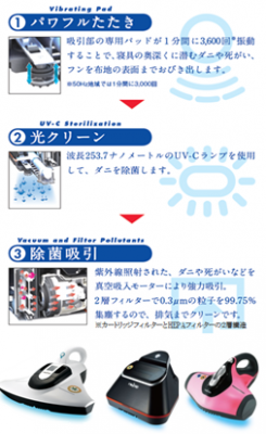 光クリーンとは、寝具の中に潜むダニをたたき出し、UV(紫外線)を照射しつつ吸引することによってダニ・細菌を除菌し、寝具の衛生を保つ、総合的メカニズムです。