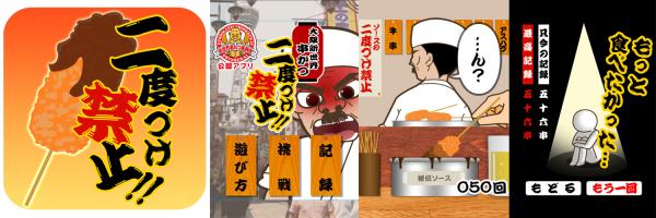 株式会社Searchは、「新世界串かつ振興会」http://www.94katu.com/とのコラボアプリ「2度づけ禁止」を2012年12月18日よりAppstoreにてリリースすることとなりました。同ゲームは、大阪新世界独自の串かつルール、ソースの2度づけ禁止をモチーフにし、iPhoneアプリで再現しています。「だるまさんが転んだ」の要領で店主が後ろを向いている間に串かつをスワイプし秘伝ソースにつけ、店主に見つからずに何回ソースにつけられるかを競うゲームです。見つかってしまったらゲームオーバー。大阪らしいオリジナルゲーム音楽もゲームを盛り上げています。大阪新世界串かつ文化をゲームで楽しめます。