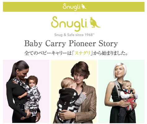 今回取り扱いを開始する「Snugli スナグリ」は、1968年にスナグリの発案者アン・ムーアにより、世界初のベビーキャリーとして誕生しました。赤ちゃんを抱いているときも両手を自由に使える「スナグリ」は全米でヒットし、その発想とデザインが認められ国立スミソニアン博物館に永久展示されています。そして「しっかりと優しく赤ちゃんを抱く」を基本に今も「スナグリ」は進化を続けています。近年デザイナー、ジェニファー・デロンギにより新たにデザインされた「スナグリ」は、そのファッション性の高さがニューヨーカーにも支持され、全米で愛用されています。