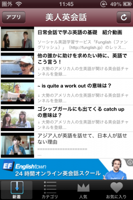 新着動画は、タブの新着のコーナーに随時更新されます。英会話学習に役立つ動画だけを厳選してるので効率的に学習を進める事ができます。