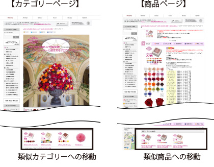 インターネットでユーザーが商品を検索する際、目的の商品を見つけたが在庫がない場合や、または類似商品のページに到達するケースがしばしば発生します。その際、ユーザーはサイト内で、類似商品・類似カテゴリーへの移動を試みますが、十分な導線が無い場合は他のサイトへ移動してしまいます。このような機会損失を防ぐため、類似商品へすぐに移動できる導線が確保されていることが重要となります。