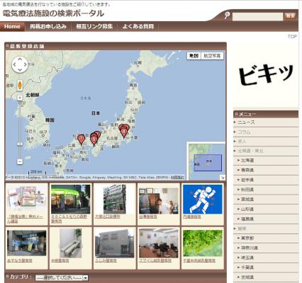 サイト閲覧者は、全国の希望地域ごとに電気療法施設をマップ表示により、
