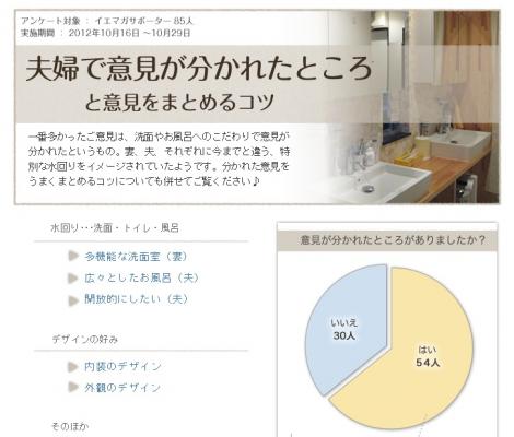 意見が分かれた個所としては「洗面・トイレ・風呂」や「キッチン」「リビング」などの場所から「デザインの好み」までと様々。特定の場所に偏ること なく多岐にわたり意見の相違が見られます。人の数だけ好みがあり、夫婦の数だけ相違点もある、という結果になりましたがいずれの場合も、意見をまとめるコ ツは「よく話し合う」というしごく当たり前の手段に落ち着くようです。