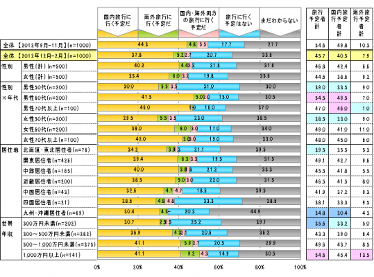 今冬の旅行予定者は全体で45.7%と、今秋に比べ8.9ポイント減少。