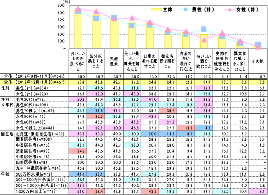 世帯年収別では、年収1,000万円以上は「おいしいものを食べること」「気分転換をすること」「日常の疲れを癒すこと」が他の年収層に比べ高い結果となりました。日常からの解放と癒しを求めていることがうかがえます。