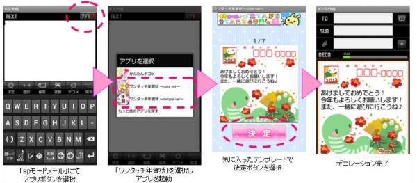 日本エンタープライズ株式会社(本社:東京都渋谷区、代表取締役社長:植田勝典)は、平成24年12月20日(木)より、株式会社エヌ・ティ・ティ・ドコモ(本社:東京都千代田区、代表取締役社長:加藤薫)がスマートフォン向けに提供している「spモードメール」に連携したアプリ『ワンタッチ年賀状』のサービスを開始いたしましたので、お知らせいたします。