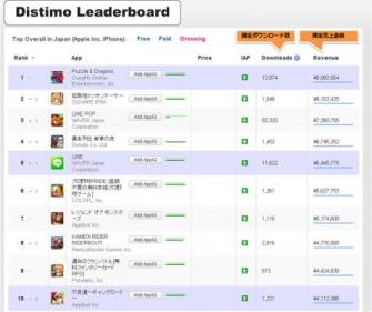 Distimo Leaderboard(ディスティモ・リーダーボード)は、全主要アプリストアの全アプリケーションのデイリーのランキングを提供。さらにこれを国別、ストア別、カテゴリ別、デバイス別、無料アプリ/有料アプリ/売上ランキング別に閲覧可能。またDistimo AppIQ(ディスティモ・アップアイキュー)はこれに加え、Apple App Store、Google Play上での全アプリの、アプリ内課金金額、有料ダウンロード金額別の推定売上金額/ダウンロード数のデータを提供。これによりスマートフォン・アプリに携わる企業は、成功しているアプリ、今後成功する可能性のあるアプリを明確化できる。またコンテンツ・デベロッパーは、ある一定のランキング内に入るためには、何日間でどれくらいのダウンロード数を達成しなければならないのか等より具体的な数値を入手できる。