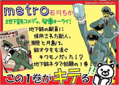 第六弾となる今回の銘柄は、オンラインコミック「EDEN」で連載中の「metro」(石川ちか/マッグガーデン)。地下鉄駅構内を舞台に二人の新人駅員の活躍(?)を描く、地下鉄駅員コメディです。二人の新人駅員はいずれも外見とは裏腹の一筋縄ではいかない強烈なキャラクター。周囲を固めるこれまた強烈な個性を持つ先輩駅員が二人に絡み、鉄道ネタから異性ネタまで、幅広く深みのある笑いを提供します。