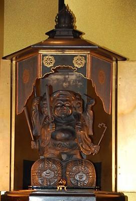 この「三面大黒天」は、その名の通り、三つのお顔を持ち、“福の神”として知られる大黒天の向かって左側に毘沙門天、右側に弁財天の御顔が合体した珍しい三面の御姿をしており、一度の拝見で「七福神三体分の御利益がある」と伝えられています。