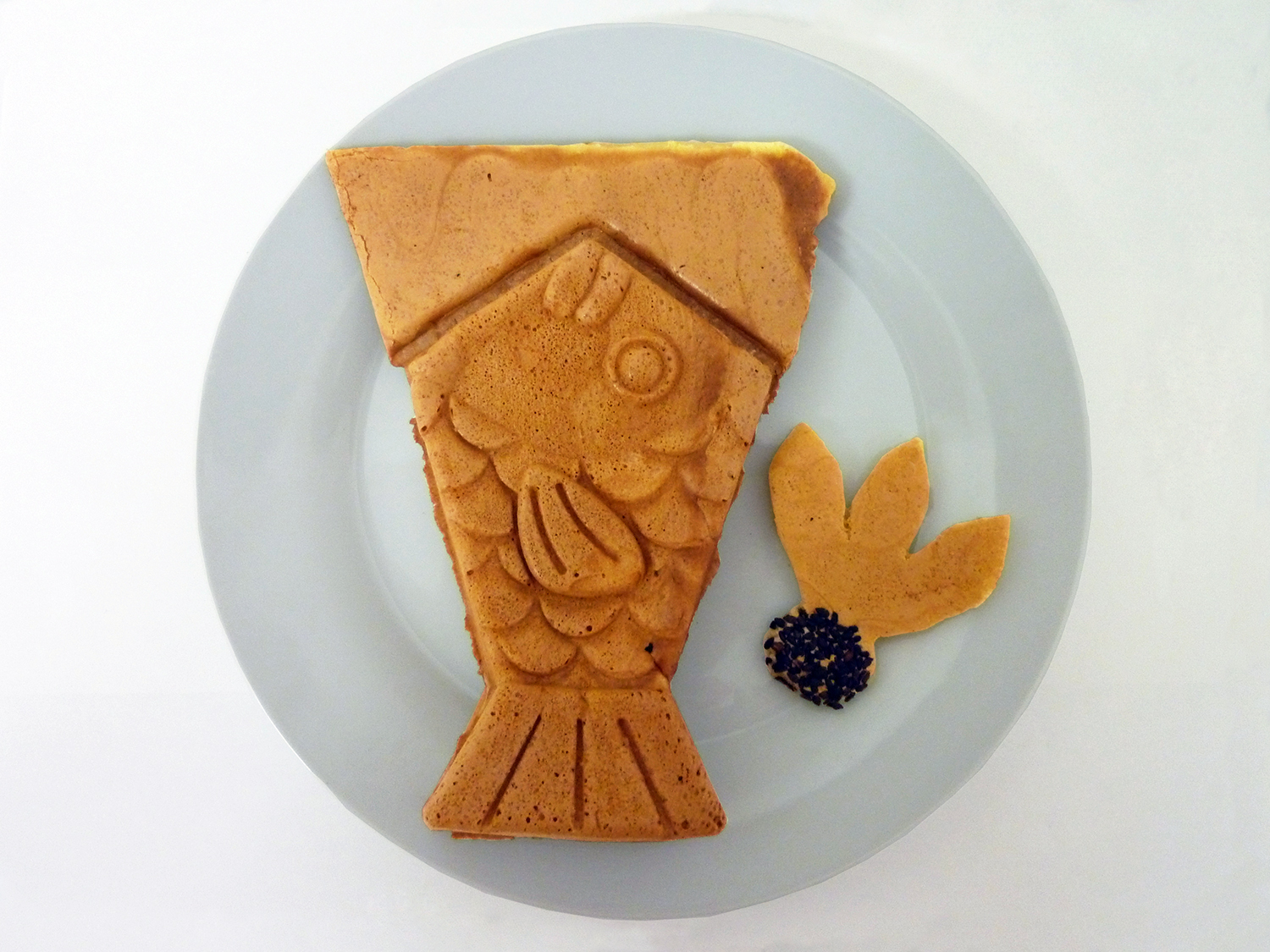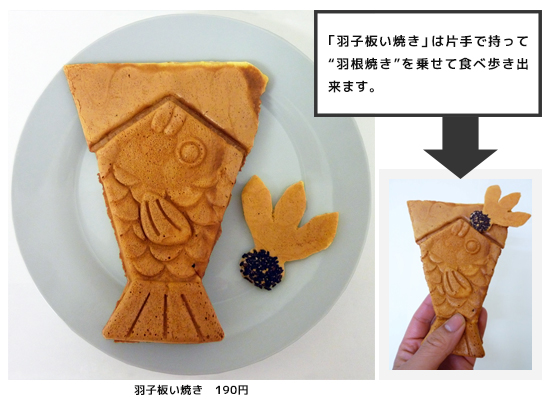ネクタイの形をした駄洒落のたい焼き「ネクたい焼」に、たい焼きの生地で羽根(たい焼きの形からはみ出した皮)を付けて羽子板の形を表現。さらに、たい焼きの生地に黒ゴマを混ぜ入れて焼いた「羽根焼き」を添えて羽子板らしさを演出しました。浅草に初詣に来たら、駄洒落たい焼きで、初笑いを味わってみてはいかがでしょうか。