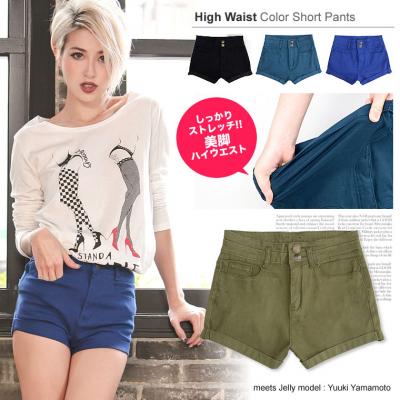 ■サイド&Backポケット付き脚長美脚ストレッチハイウエストフロントボタンシンプルカラーショートパンツ