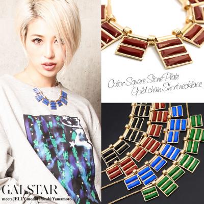 ■カラースクエアストーンプレートメタルパーツゴールドチェーンショートネックレス