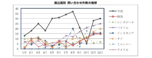2012年の大きなトピックとしては、尖閣諸島問題での中国進出に対する急ブレーキが挙げられますが、相談件数にも如実に現れています。ただし、周辺国の台頭により、尖閣諸島問題以前から相談における中国進出の占める割合は低下しており、11月、12月の割合を見ても、長らく続いた中国1強時代は終わりを告げ、様々な選択肢から進出先を選ぶ企業が今後も増えていくと予測されます。